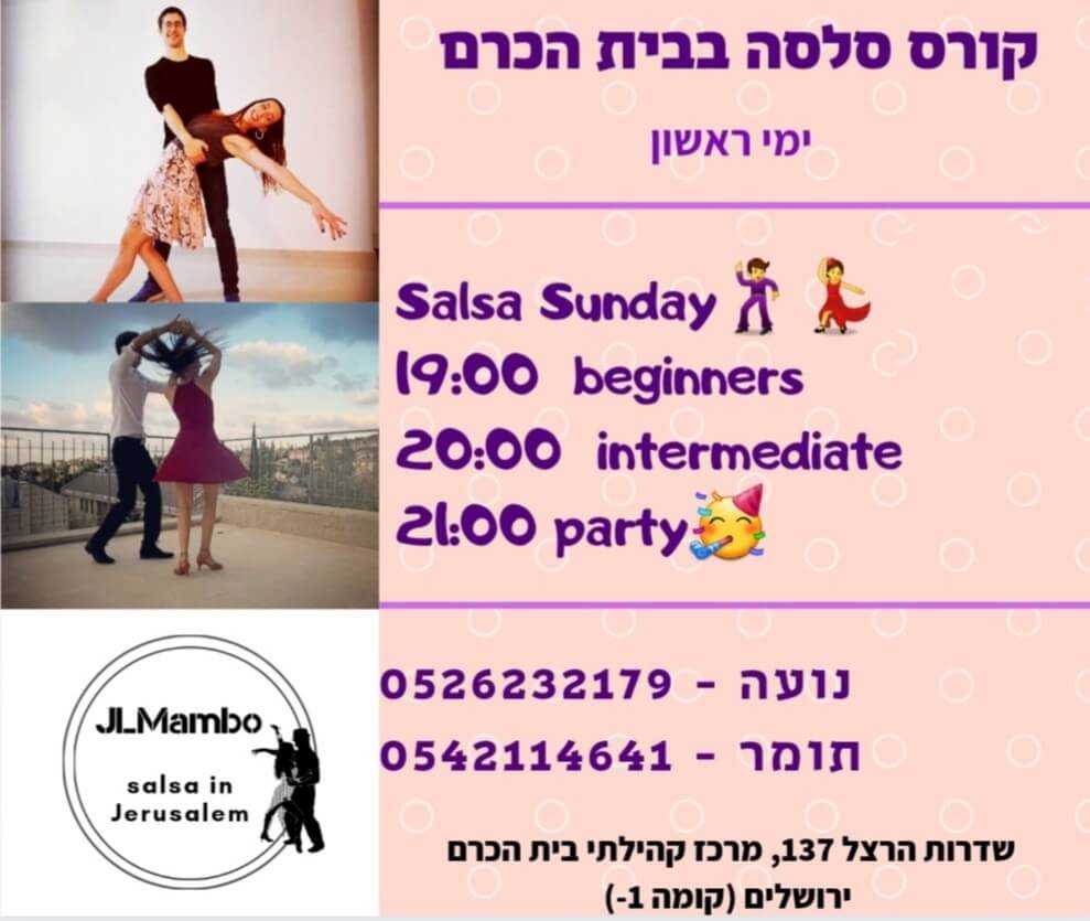 JLMambo Studio, בית ספר ללימוד סלסה, הפועל כל יום ראשון, כולל מסיבה בסוף הערב.