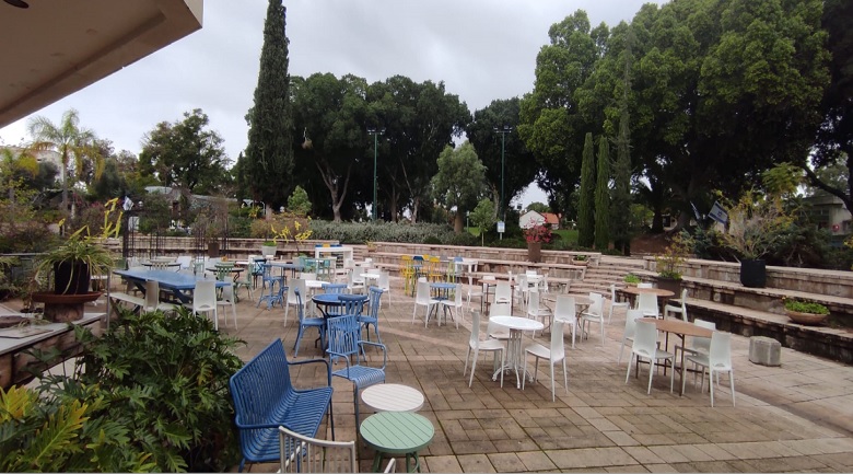 נוף קיבוצי טובל בירוק, רחבת אמפי מרוצפת אבן כורכר טבעית ואולם אירועים